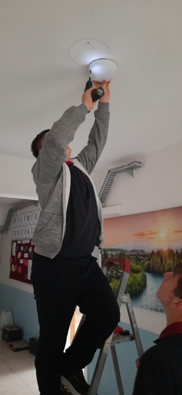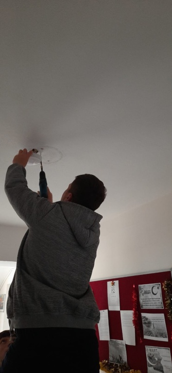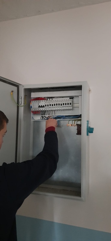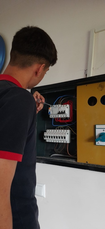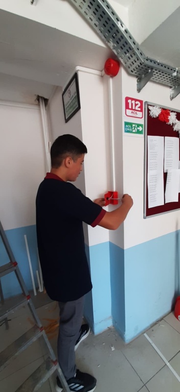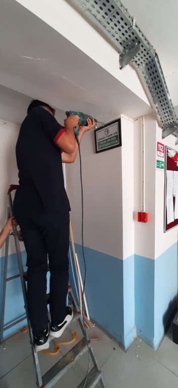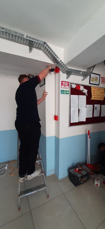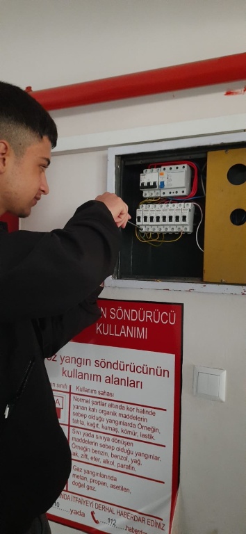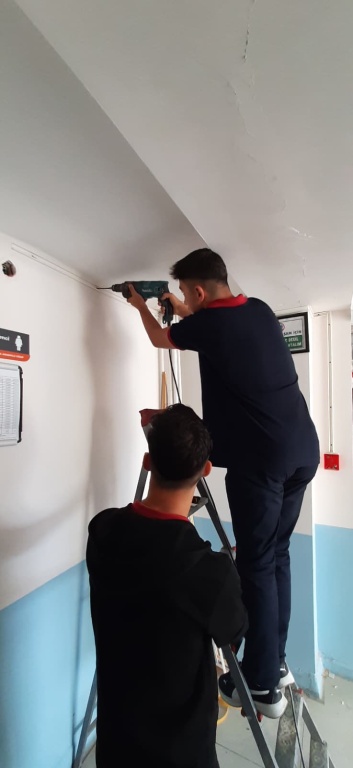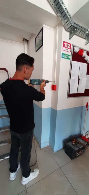 Elektrik bölümü öğrencilerimiz öğretmenleri Musa BAKIR gözetmenliğinde okulumuzda çalışmalarına devam ediyor. İş sağlığı ve güvenliği kapsamında elektrik tesisatı yenileniyor. Panolara kaçak akım koruma rölesi takıldı. Yangın sistemi kuruldu. Aydınlatma sistemi yenileniyor.
